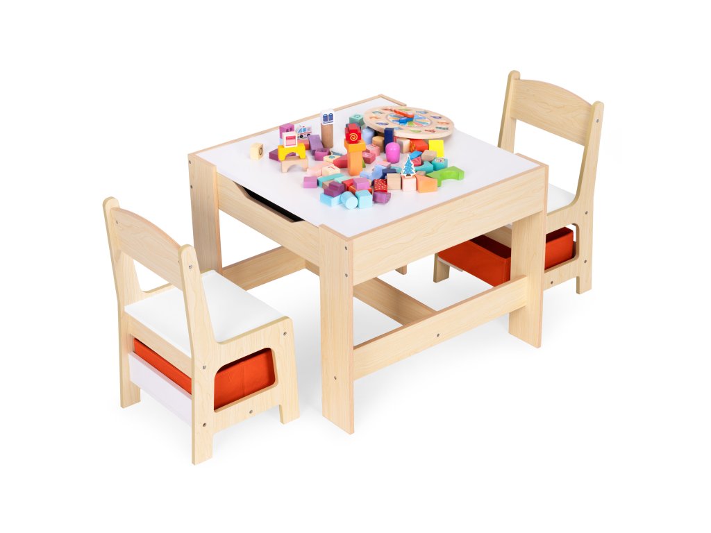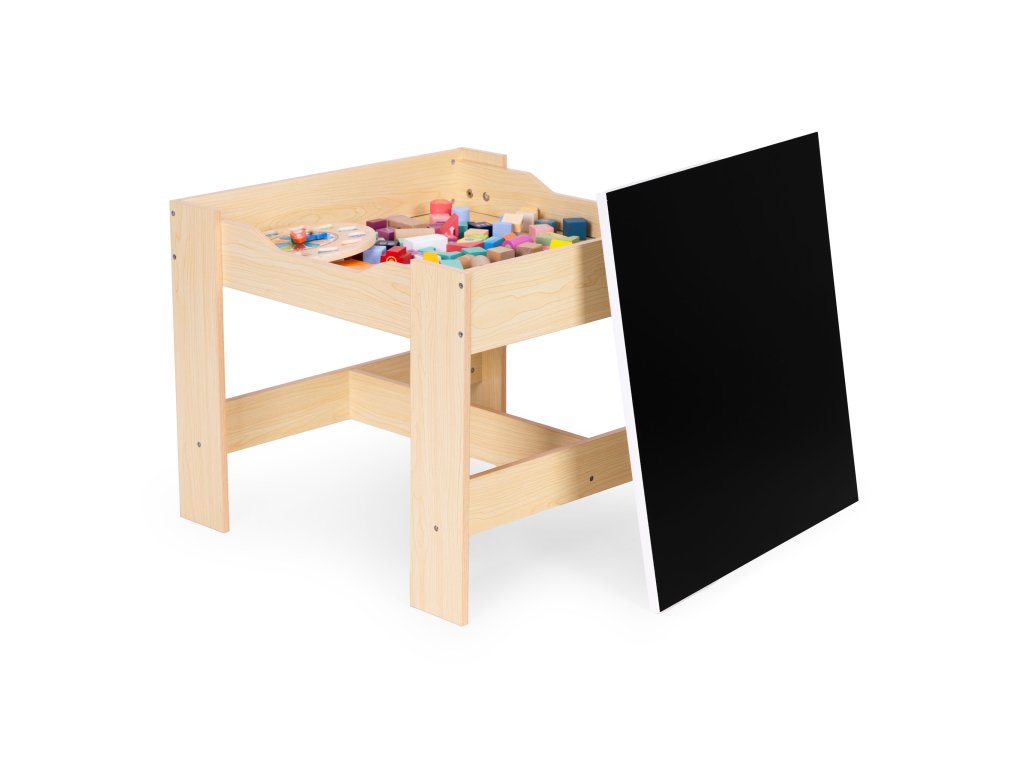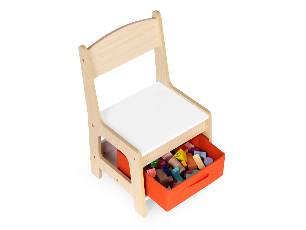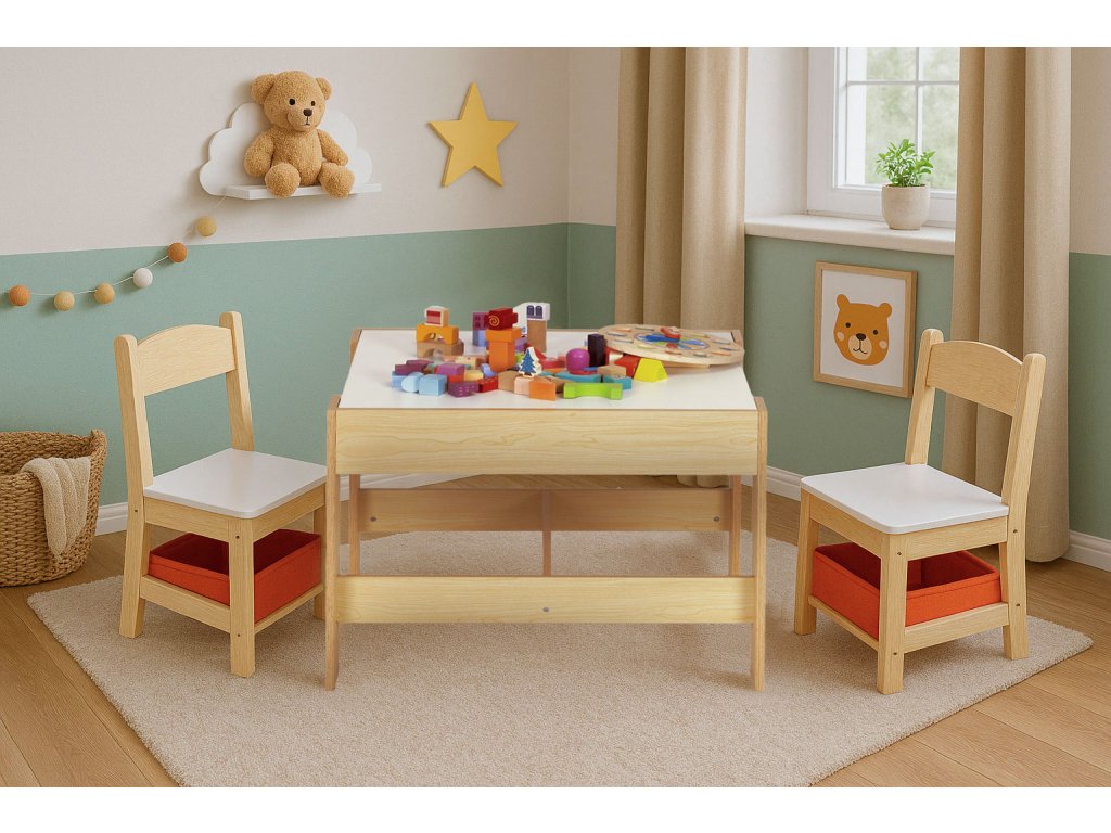Stôl je vybavenýpraktická odnímateľná stolová doska ktorá pod sebou ukrýva priestranný priestor. Jediným pohybom si dieťa môže siahnuť na svoje obľúbené pastelky, kocky alebo knihy -bez toho, aby ste museli vstať alebo prerušiť hru. Je to skvelé riešenie, ktoré zjednodušuje každodenné činnosti aučí samostatnosti a organizovanosti. Tento dômyselne navrhnutý kúsok zaručuje, že všetko, čo vaše dieťa potrebuje, bude mať vždy na dosahčistá a uprataná miestnosť.