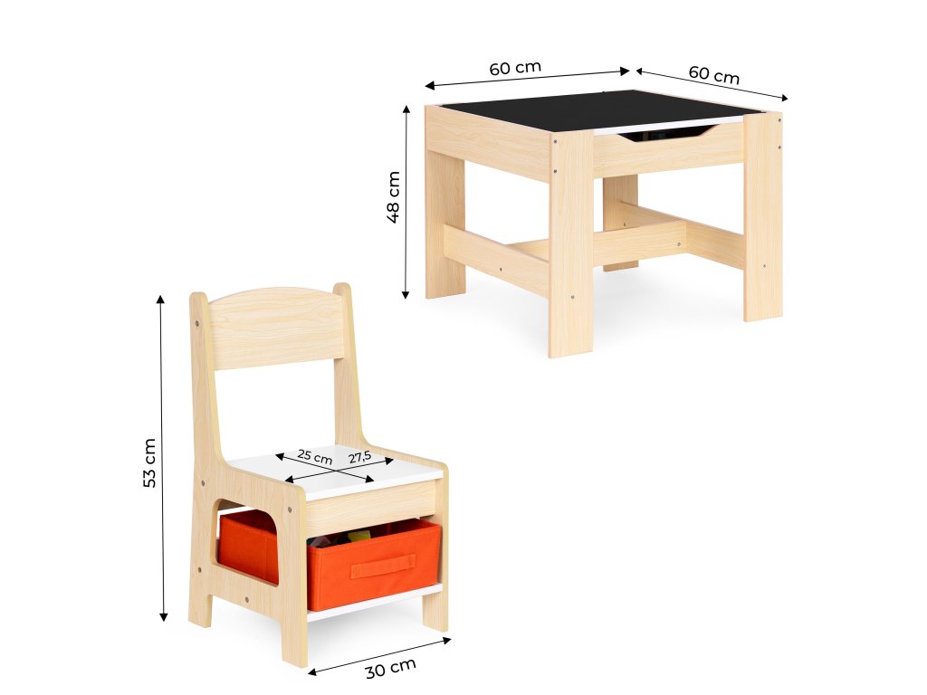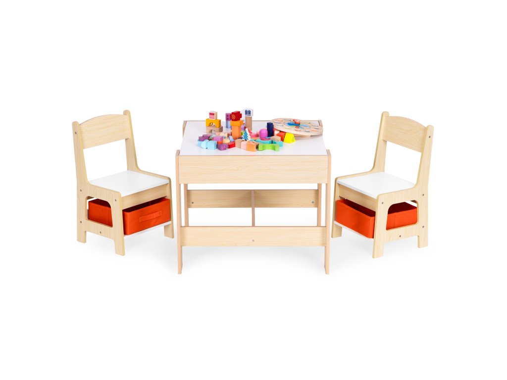 Detská súprava nábytku od je ideálnym riešením pre rodičov, ktorí hľadajúpraktické, bezpečné a štýlové vybavenie detskej izby. Súprava obsahujestôl s obojstrannou doskou adve stoličky, každý vybavenýtextilná zásuvka pod sedadlom. To uľahčuje aj najmenším deťomudržiavať poriadok v ich prostredí, učia sa organizácii od útleho veku.