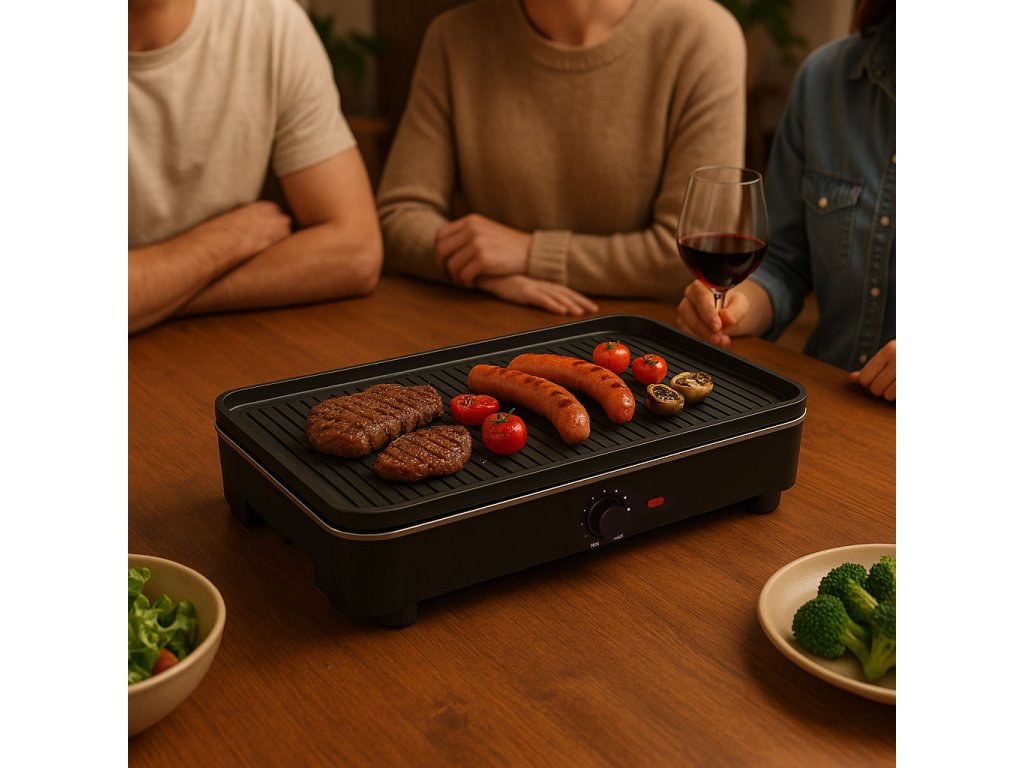 Zabudovaný termostat s kontrolkou umožňuje presná regulácia teploty, aby bol každý pokrm - od šťavnatého mäsa až po jemnú zeleninu - dokonale uvarený. Konštantná teplota zaručujerovnomerné grilovanie bez spálenia a potrebu neustáleho dohľadu.