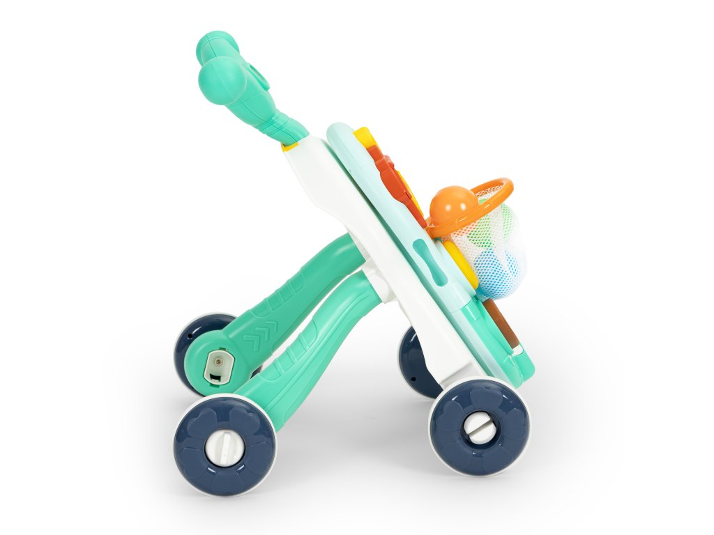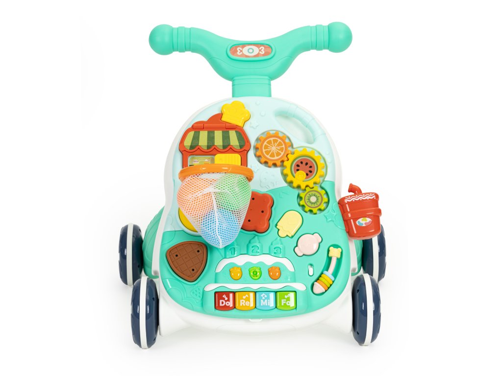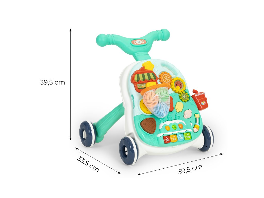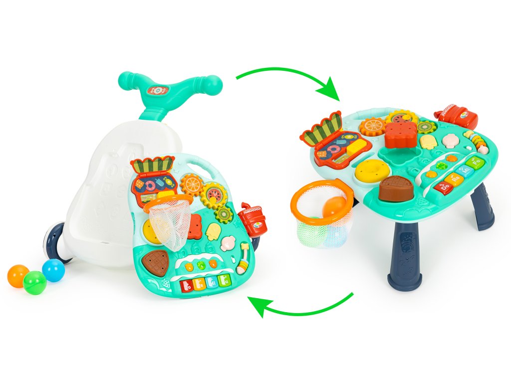 Stačí oddeliť panel na prednej strane posúvača, nainštalovať nohy a môžete používať funkčný stôl smnoho pohyblivých prvkov.Zaujímavým doplnkom je maláklavír, ktorý hrá zvuky a melódie, je sa určite rýchlo stane obľúbeným prvkom hračky,poskytuje každému dieťaťu skvelú zábavu.