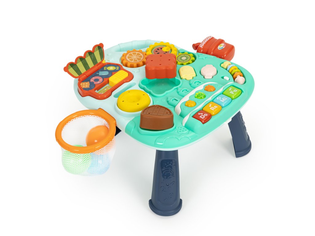 Stôl sa skladá z predného panelu tlačiacej časti a 3 nôh, ktoré sú súčasťou súpravy, vďaka možnosti odpojenia vaše batoľamôžete ho používať ako samostatnú hračku alebopremeniť ho na funkčný stôl plný prvkov, ktoré zabezpečia dobrú zábavu.