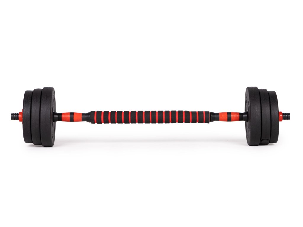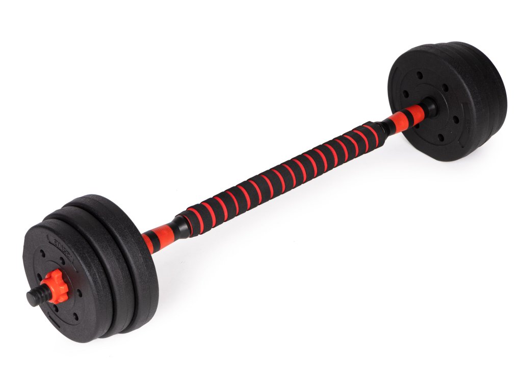 Sada obsahuje špeciálny tyč, ktorá po zostavení s dvoma činkami, vytvára funkčnú činku .
