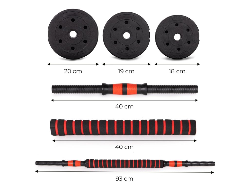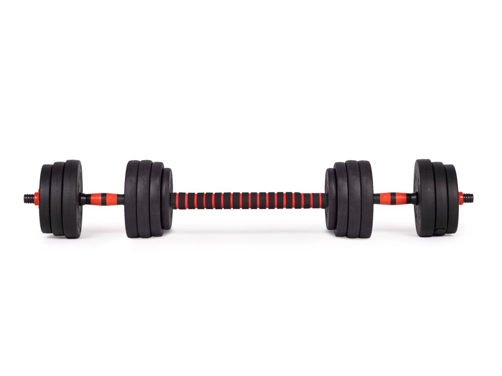 Súprava obsahuje 12 tanierov , vďaka ktorej môžete prispôsobiť hmotnosť vykonávanému tréningu. Rukoväť činky jeprofilovaný a poskytuje pevný úchop počas cvičení.