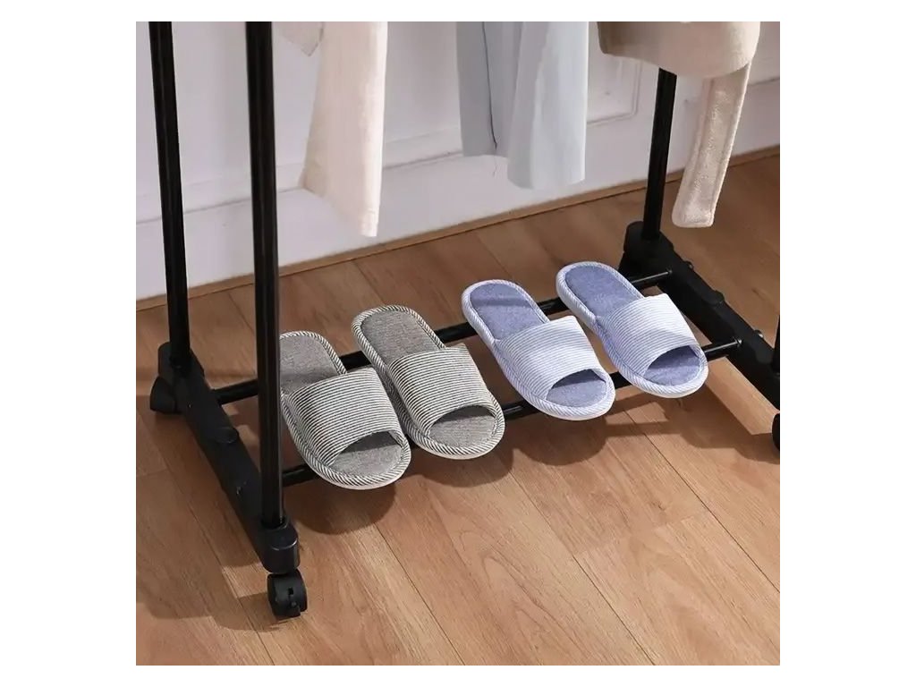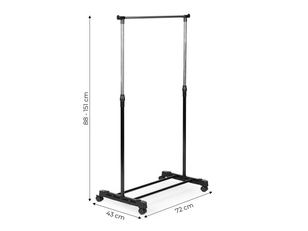 - Krytky umiestnené na koncoch tyče stojana zaistenie bezpečnosti. Táto konštrukciaeliminuje riziko náhodného skĺznutia oblečenia, čo by mohlo viesť k vráskam, poškodeniu alebo znečisteniu. Konce tyčí sa navyše dajú použiť ako háčiky na zavesenie tašiek, šálov, klobúkov a iných drobných predmetov.