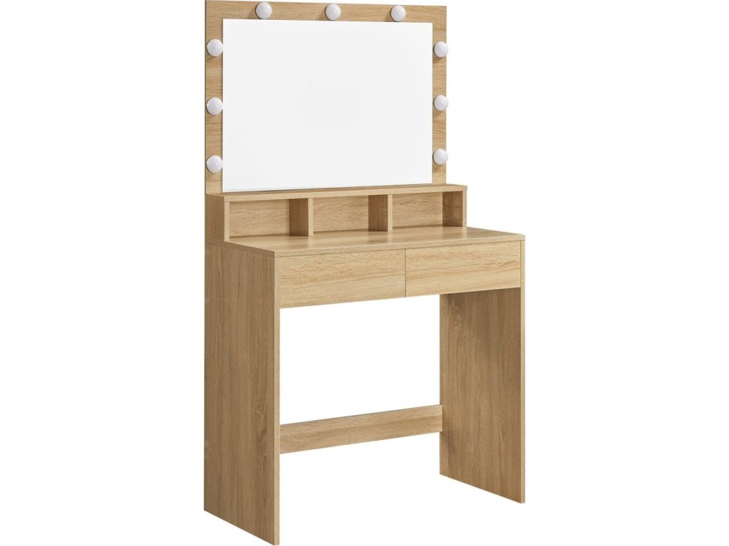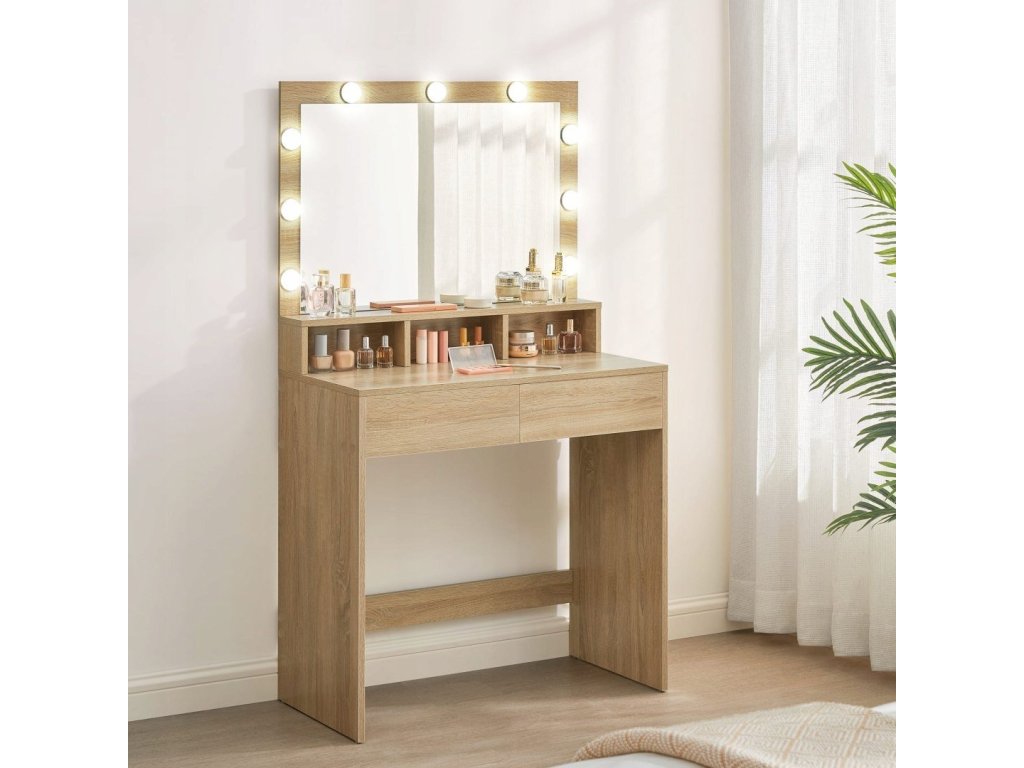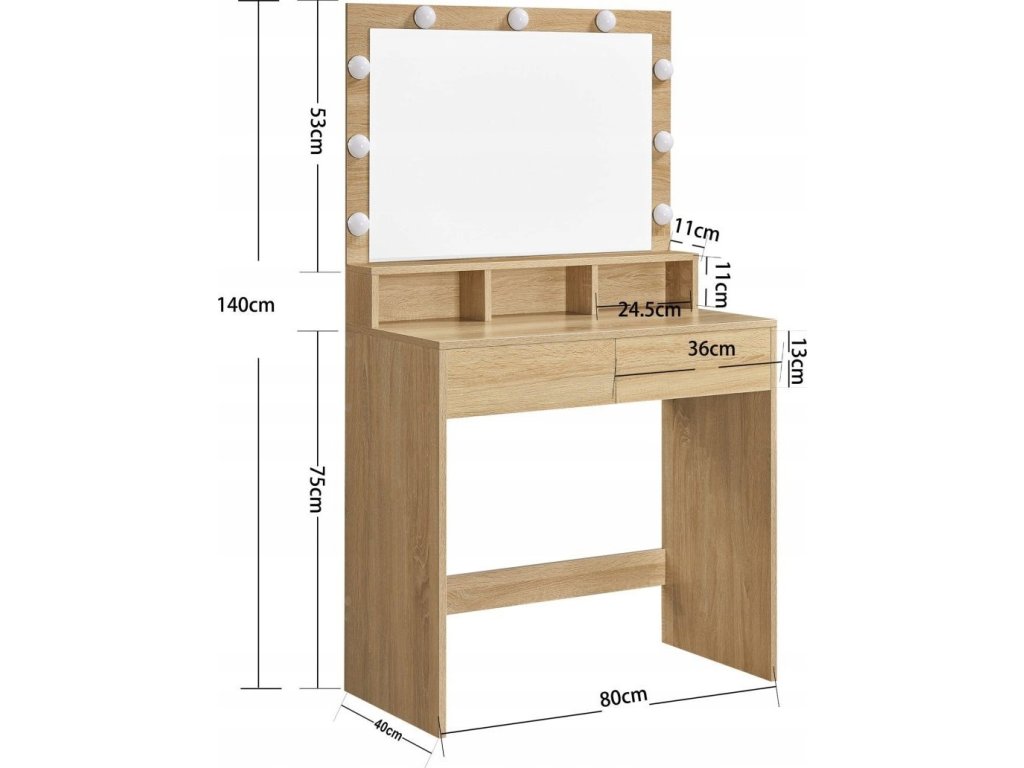 Veľký kozmetický toaletný stolík s LED osvetlením, zrkadlom, zásuvkami, dub Sonoma