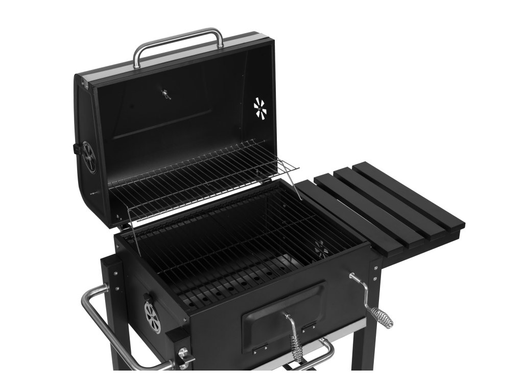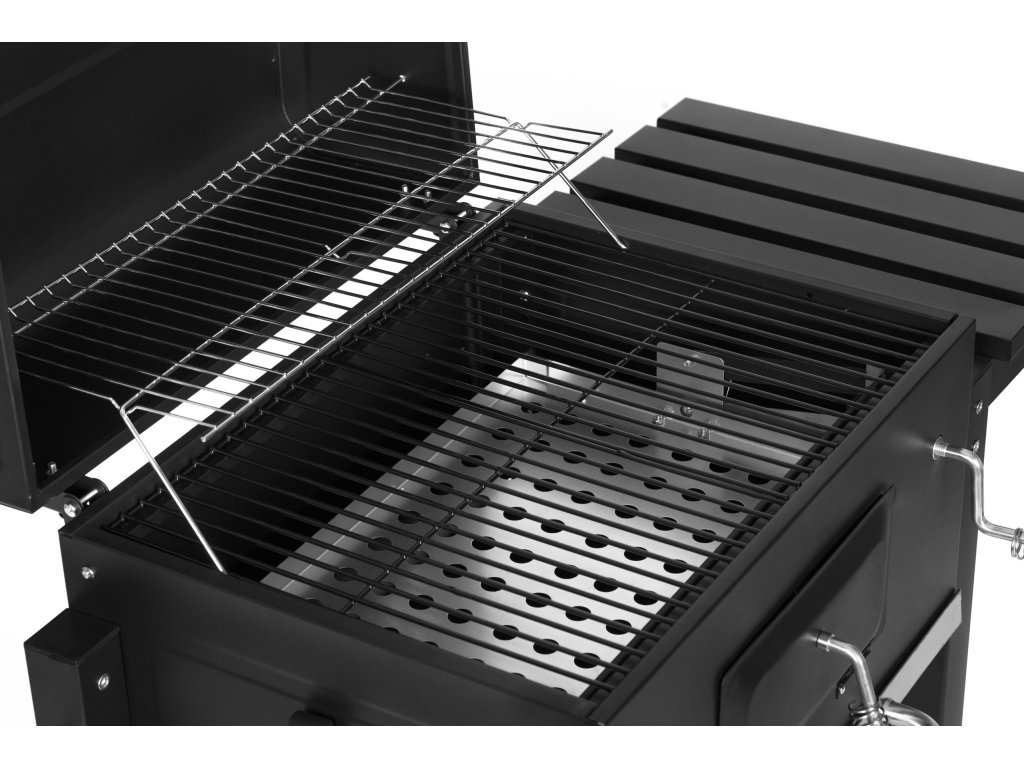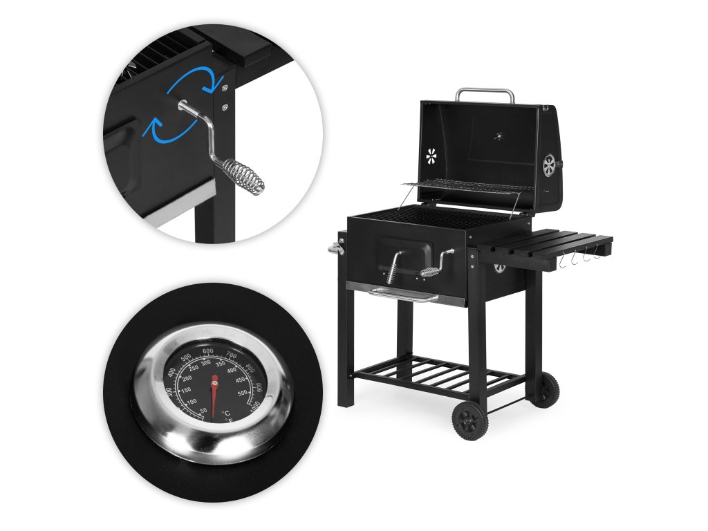 - Nastaviteľná výška grilovacieho roštu - Na pravej strane, v prednej časti grilu, sa nachádza špeciálna otočná rukoväť. Vďaka tomu môžete nastaviť výšku zásobníka na drevené uhlie, čím získate kontrolu nad intenzitou grilovania. Rukoväť je navrhnutá tak, aby počas grilovania zostala chladná.